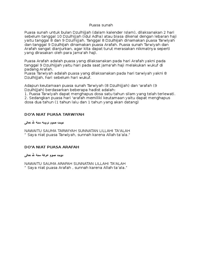 Pengertian niat keutamaan puasa tarwiyah dan arafah pengertian puasa hari tarwiyah dan arafah pada bulan dzulhijjah dalam kalender islam dilaksanakan 2 hari sebelum tanggal 10 dzulhijjah idul adha atau biasa dikenal dengan lebaran haji yaitu tanggal 8 dan 9 dzulhijjah. Salah satu amalan utama di awal dzulhijjah adalah puasa arafah pada tanggal 9 dzulhijjah.