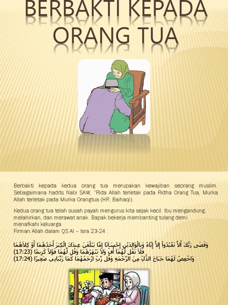 Point point seorang anak yang telah lahirkan didunia ini adalah melainkan dari taat kepada perintah allah swt dan berbakti kepada kedua orang tua. Pengertian ayat dan keutamaan berbuat baik kepada orang tua sebagai orang muslim kita harus selalu berbuat baik berperilaku jujur dan terimplementasi dalam kehidupan sehari hariagar menjadi orang yang bersih dan jujur kita harus berusaha berada bersama orang orang yang jujur baik dan benar. Begitu sangat disayangkan betapa banyak orang yang ketika sudah berkeluarga mereka meninggalkan kewajiban ini.