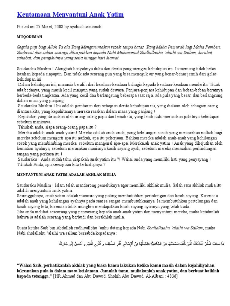 Keutamaan menyantuni anak yatim. Hadist tentang keutamaan anak yatim. Sholawat dan salam semoga dilimpahkan kepada nabi muhammad shollallohu alaihi wa sallam kerabat sahabat dan pengikutnya yang setia hingga hari kiamat. Lembaga sosial dan dakwah yang menjalankan amanah ibadah sosial menyantuni anak anak yatim piatu dan dhuafa serta meyebarkan syiar agama melalui pendidikan kepada anak anak yatim piatu dan dhuafa.