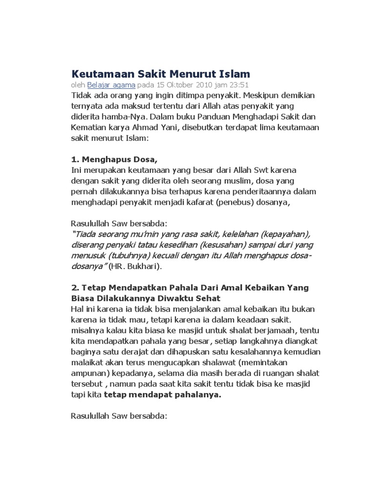 Keutamaan orang sakit menurut islam. Sudah sewajarnya jika sesama muslim harus saling tolong menolong baik dalam keadaan senang maupun dalam keadaan duka. Mengunjungi orang sakit merupakan perbuatan mulia dan terdapat keutamaan yang agung serta pahala yang sangat besar dan merupakan salah satu hak setiap muslim terhadap muslim lainnya. Ada orang yang sakit flu atau batuk saja merasa menerima musibah yang besar.