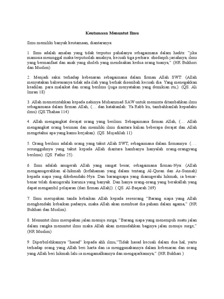 Keutamaan orang yang menuntut ilmu dan mengajarkannya adalah. Di sinilah bukti bahwa allah swt pemilik segala ilmu menunjukkan kekuasaan nya bagi orang orang berakal dan beriman untuk lebih giat menuntut ilmu agar manusia mengenal siapa dirinya dan siapa tuhannya sehingga ia menjadi manusia yang bertakwa dan berakhlak mulia. Setiap muslim dan muslimah harus mengetahui bahwa orang yang menuntut ilmu adalah orang yang bahagia karena ia mendengarkan ayat ayat al qur an hadits hadits nabi shallallaahu alaihi wa sallam dan perkataan para shahabat. Orang yang menuntut ilmu syari kemudian dia mengajarkannya kepada orang lain tapi dia tidak mengamalkan yang wajib dan sunnah maka dia adalah orang yang fasik dan kita tidak boleh mengambil ilmu darinya.
