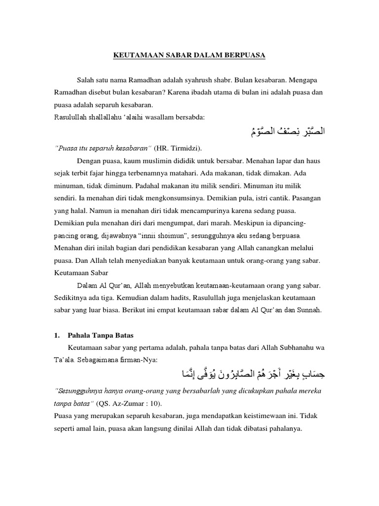 Keutamaan orang sabar. Hal ini menunjukkan besarnya keutamaan orang yang bersabar. Allah taala berfirman yang artinya sesungguhnya hanya orang orang yang bersabarlah yang dicukupkan pahala mereka tanpa batas qs. Selain telah tertuang dalam banyak surat surat al quran yang secara khusus dimana allah memerintahkan langsung kepada umat untuk menerapkan sabar dalam setiap masalah yang dihadapi perkara sabar juga memiliki banyak keutamaan dalam islam baik keutamaan duniawi maupun keutamaan ukhrowi.